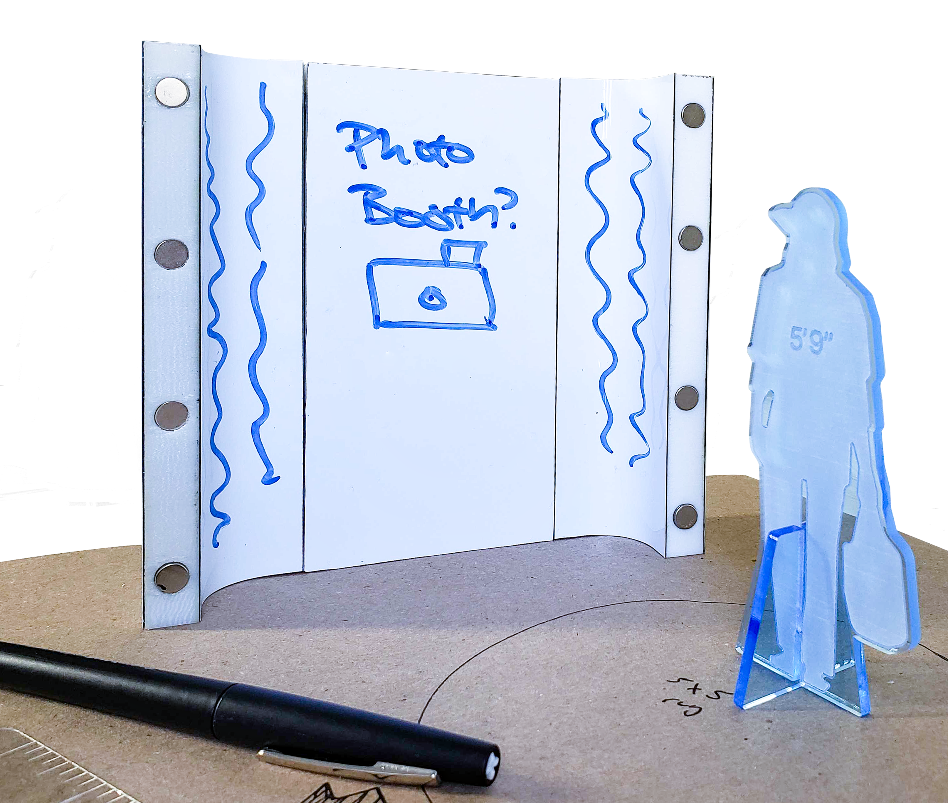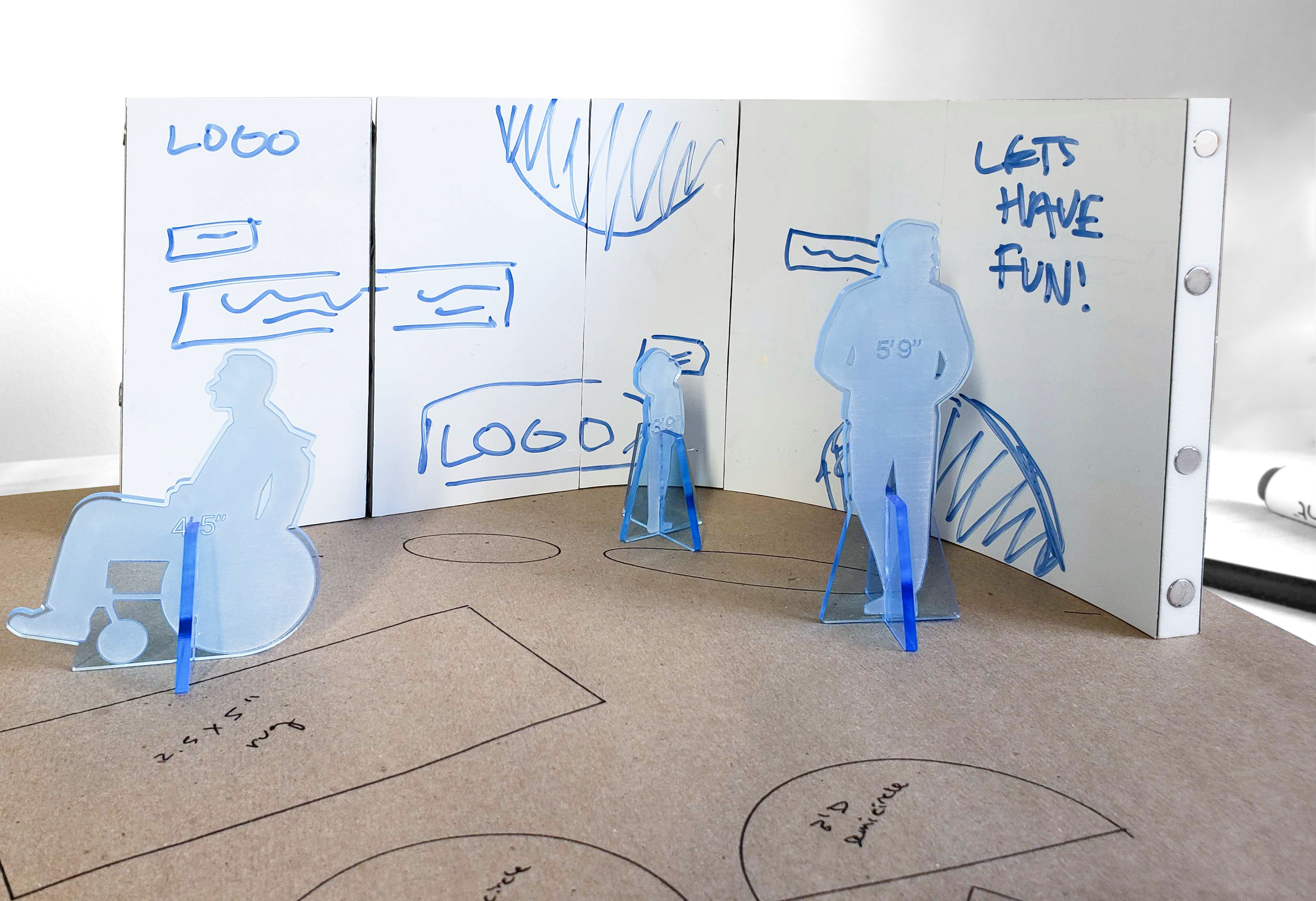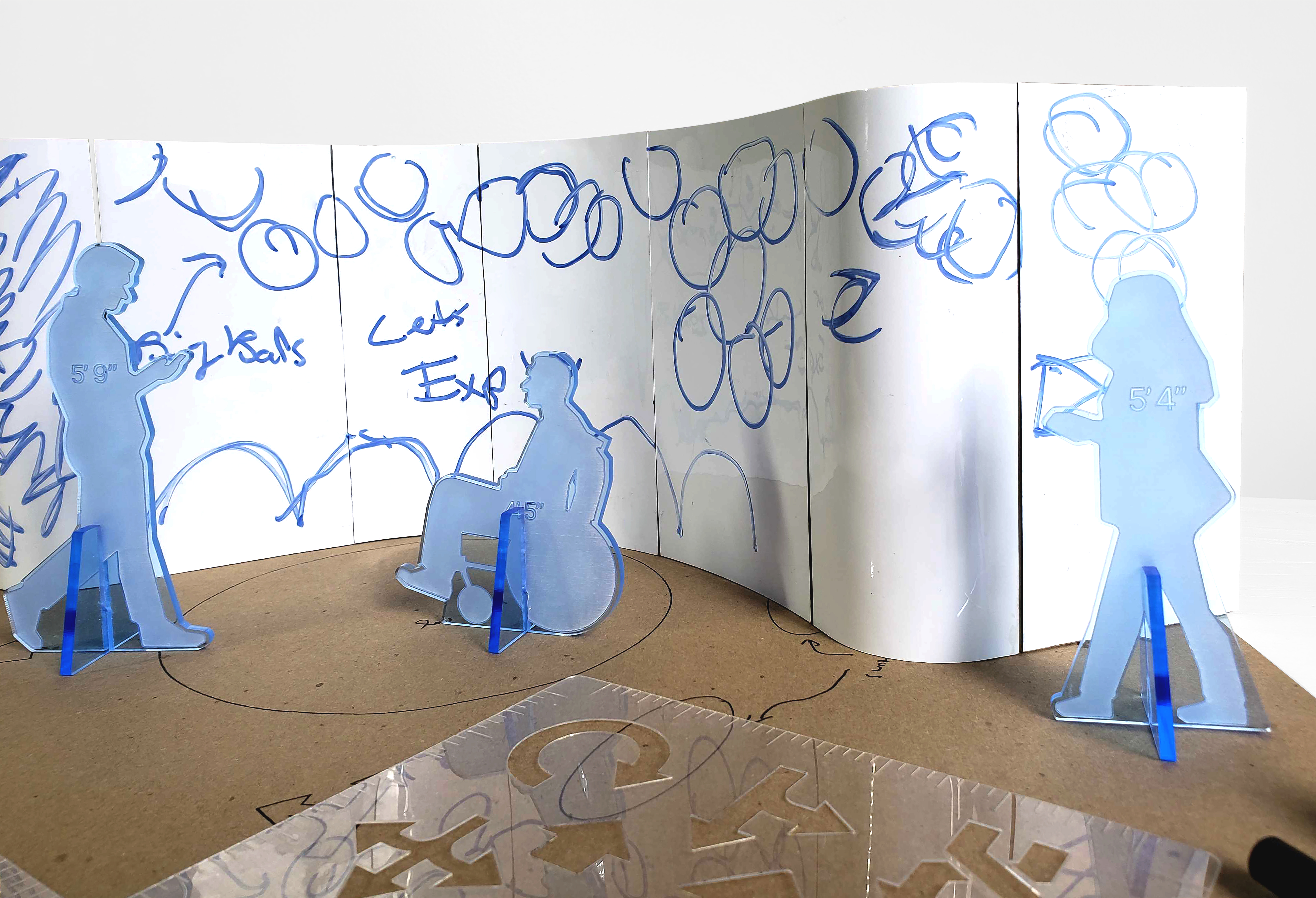 This kit comprises 3D-printed, modular wall components with magnetic connections and dry-erase surfaces for sketching. In addition to further adding to the storytelling experience and more accurate modeling, there are laser-cut templates for floor wayfinding and scaled silhouettes of different heights to represent the variety of audience members and their accessibility needs.