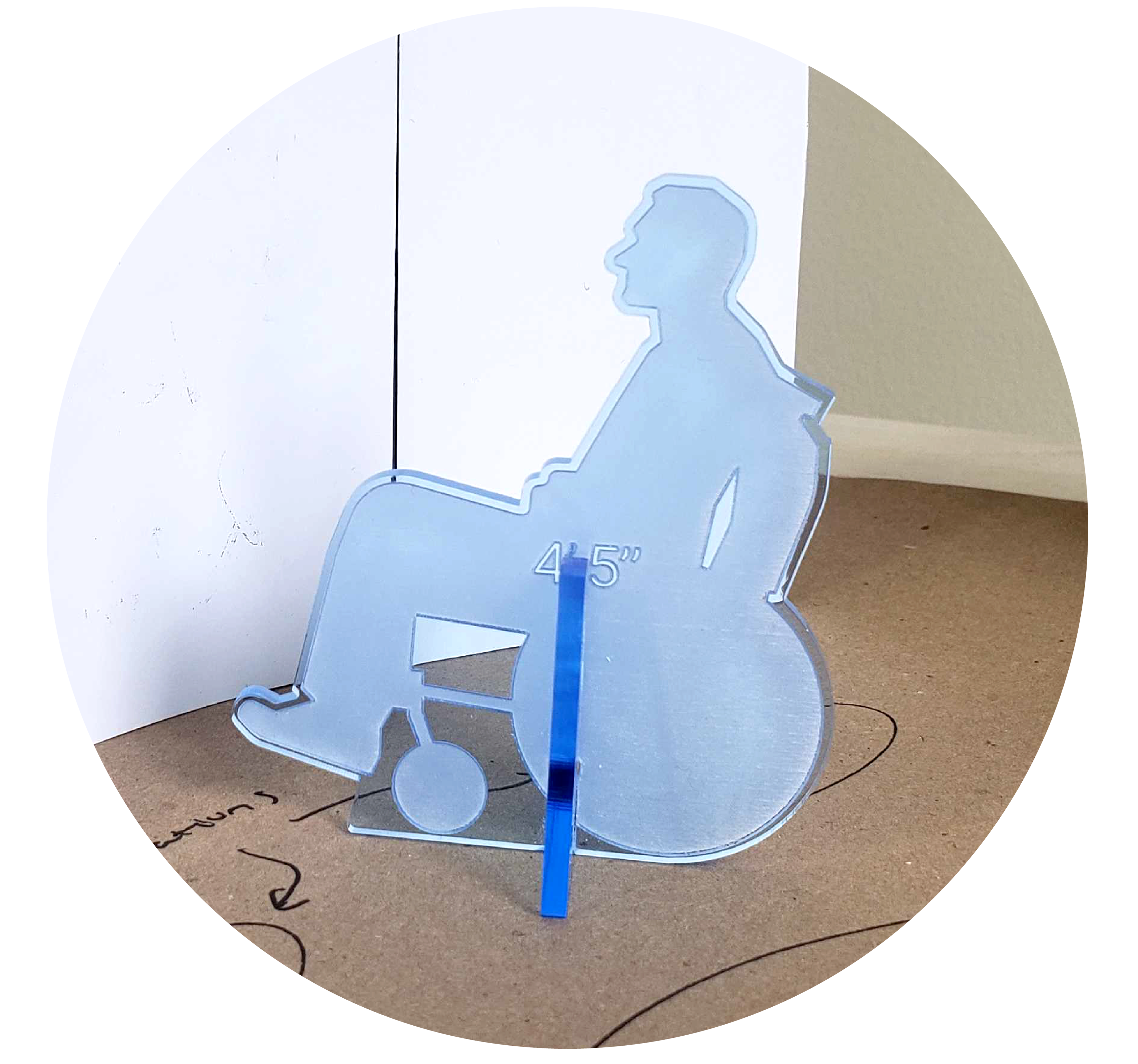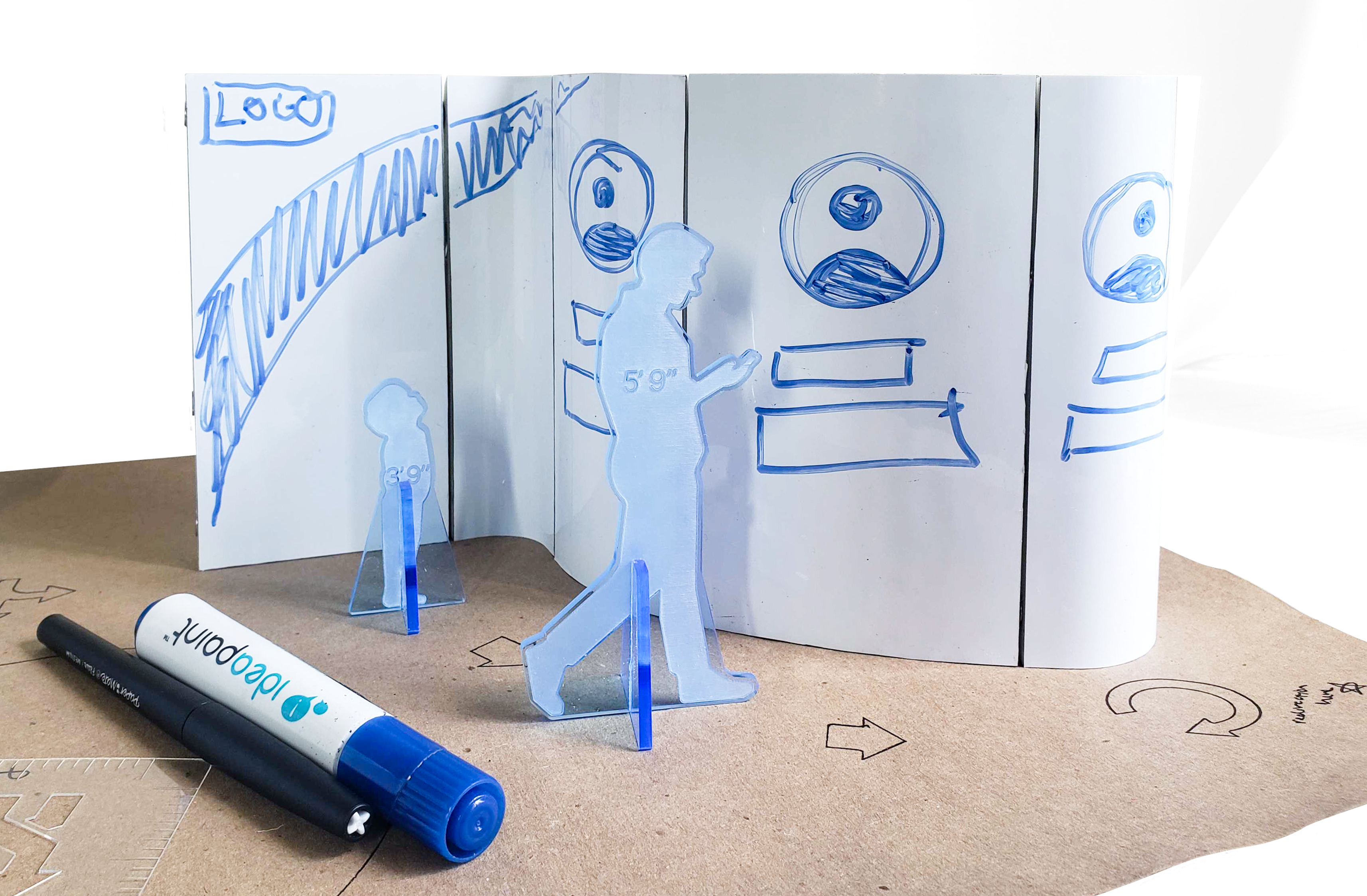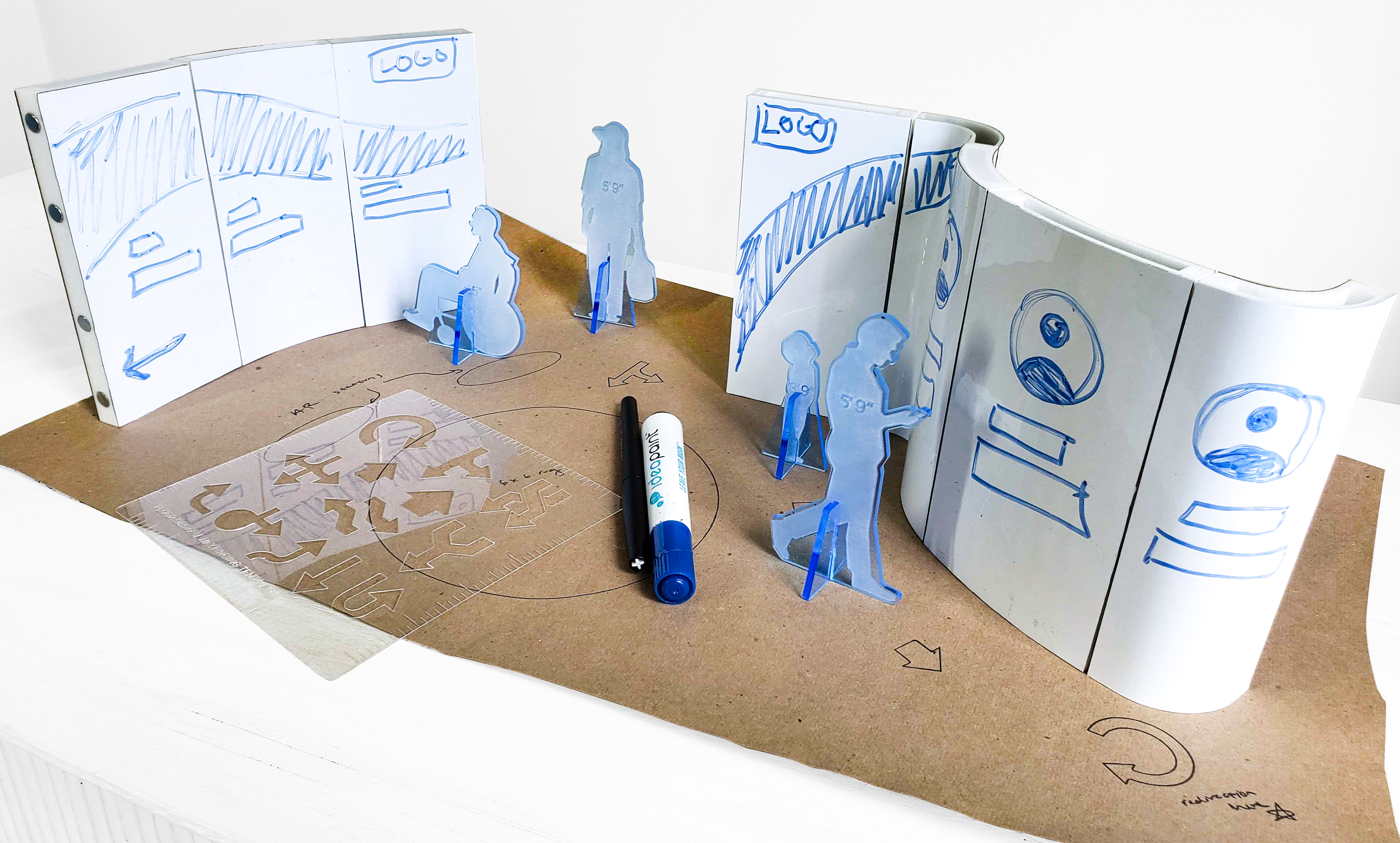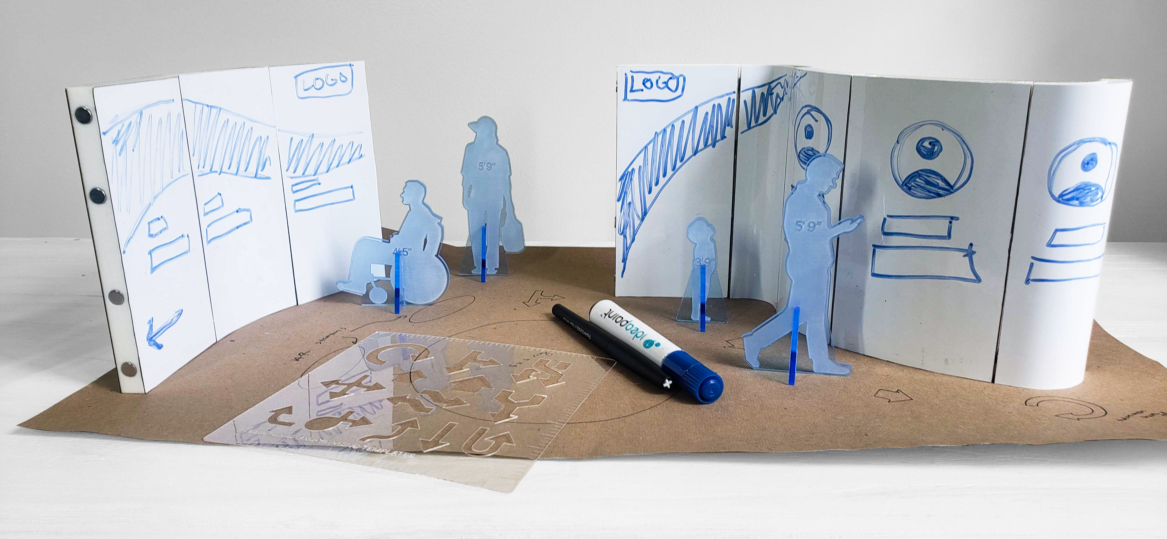 This kit comprises 3D-printed, modular wall components with magnetic connections and dry-erase surfaces for sketching. In addition to further adding to the storytelling experience and more accurate modeling, there are laser-cut templates for floor wayfinding and scaled silhouettes of different heights to represent the variety of audience members and their accessibility needs.