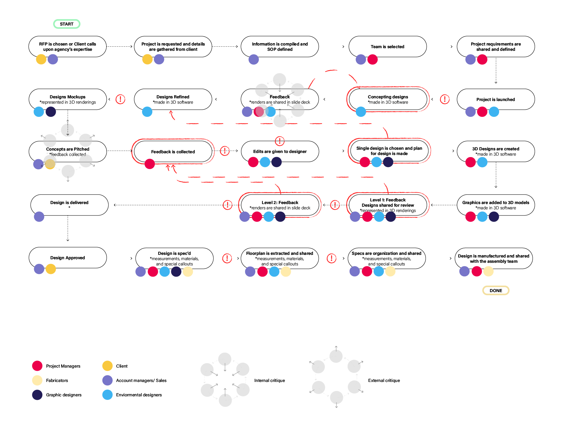 ︎ Define problem spaces within the design process and any external stakeholders in tradeshow design and fabrication.