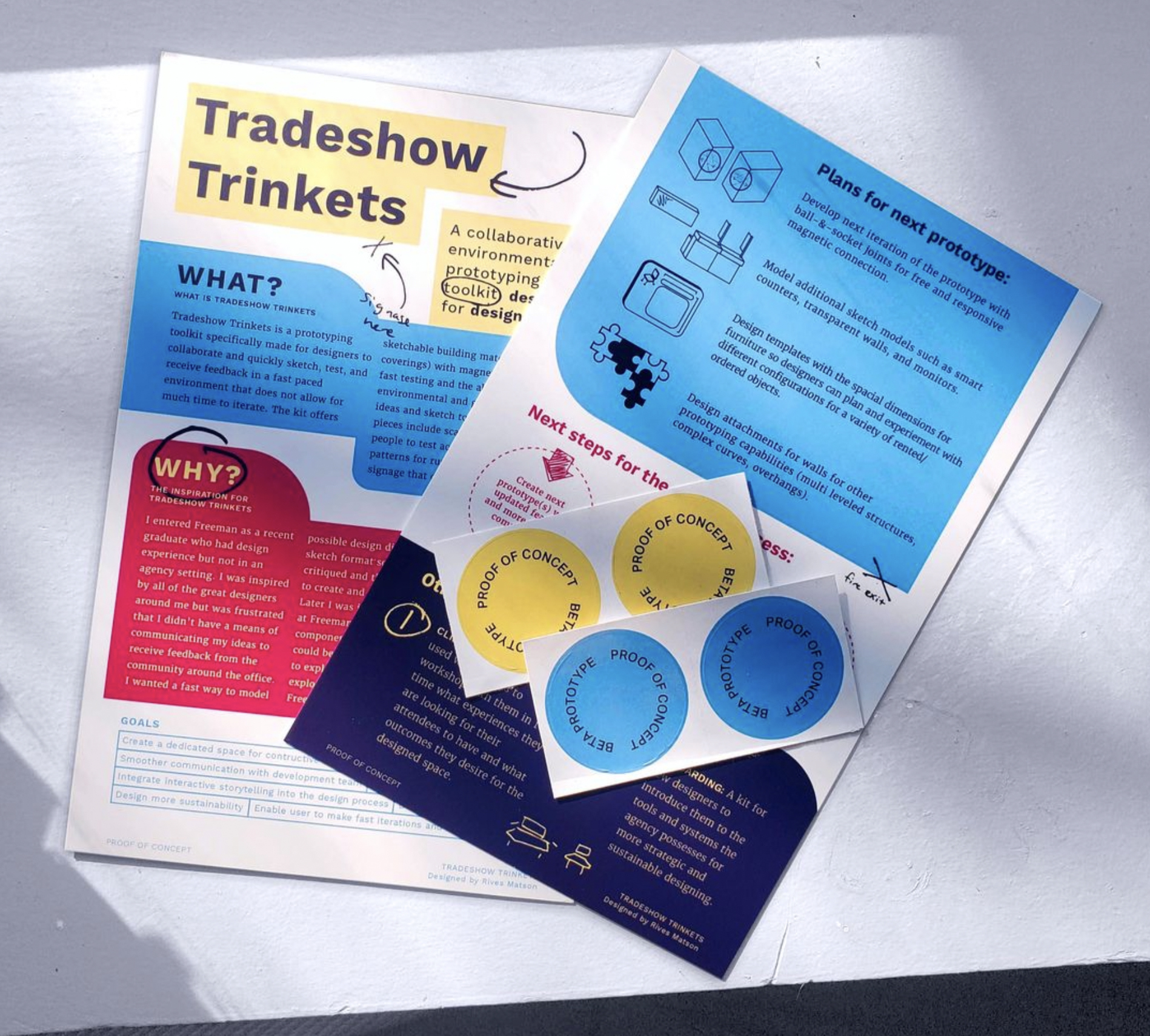 The design approach was inspired by designer Cas Holman, a toy designer and professor at the Rhode Island School of Design. Their approach of using toys as tools to pose open-ended questions and to investigate the world around them freely was the quality I wanted to bring to Tradeshow Trinkets. Not to create a toolkit that will tell you the answer, but to allow designers to converse with both the materials and the design challenges they are working through, and others around them.