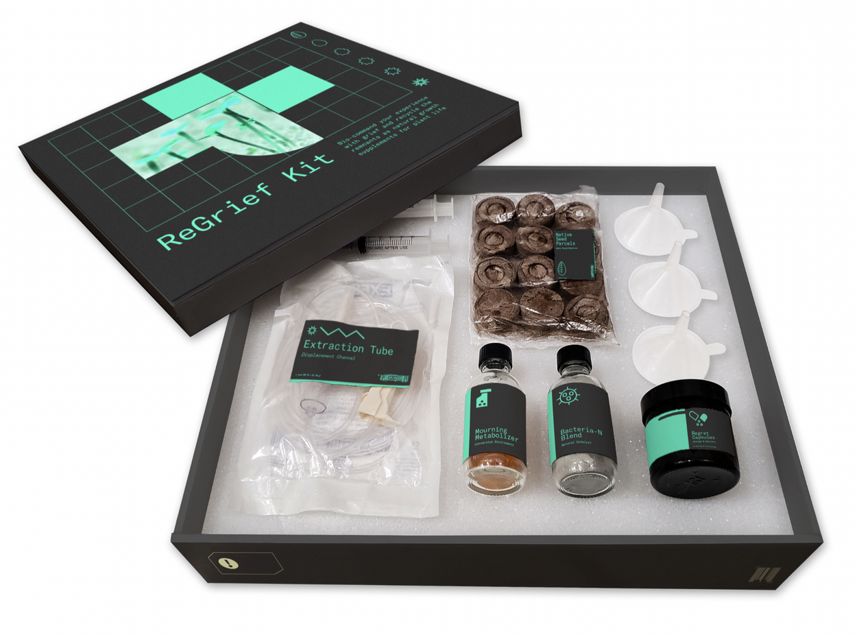Project overview: The Regrief kit is a physical exploration into the possibility of mankind repurposing their emotions into a form that is both apart from their selves and also productive for other organisms. What if we could take away our grief and put that energy into growing something rather than holding it in ourselves or suppressing these feelings with medication? What if there was a way to utilize the grief from loss and redirect it for something to be gained?